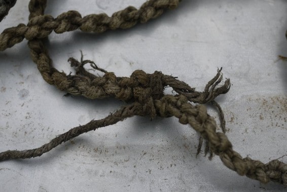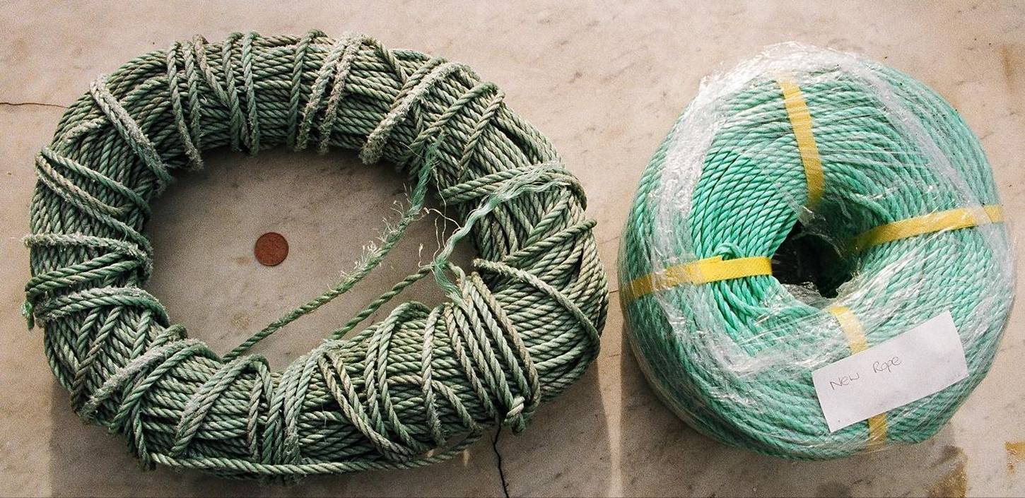 Rys. 33 Po lewej lina wyblakła i skruszała od słońca, po prawej zwój nowej liny