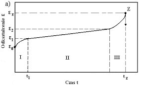 Rys. 39 Wykres pełzania materiału, Odkształcenie od czasu. I – pełzanie wstępne, II – pełzanie ustalone , III – pełzanie przyspieszone, Z - zniszczenie