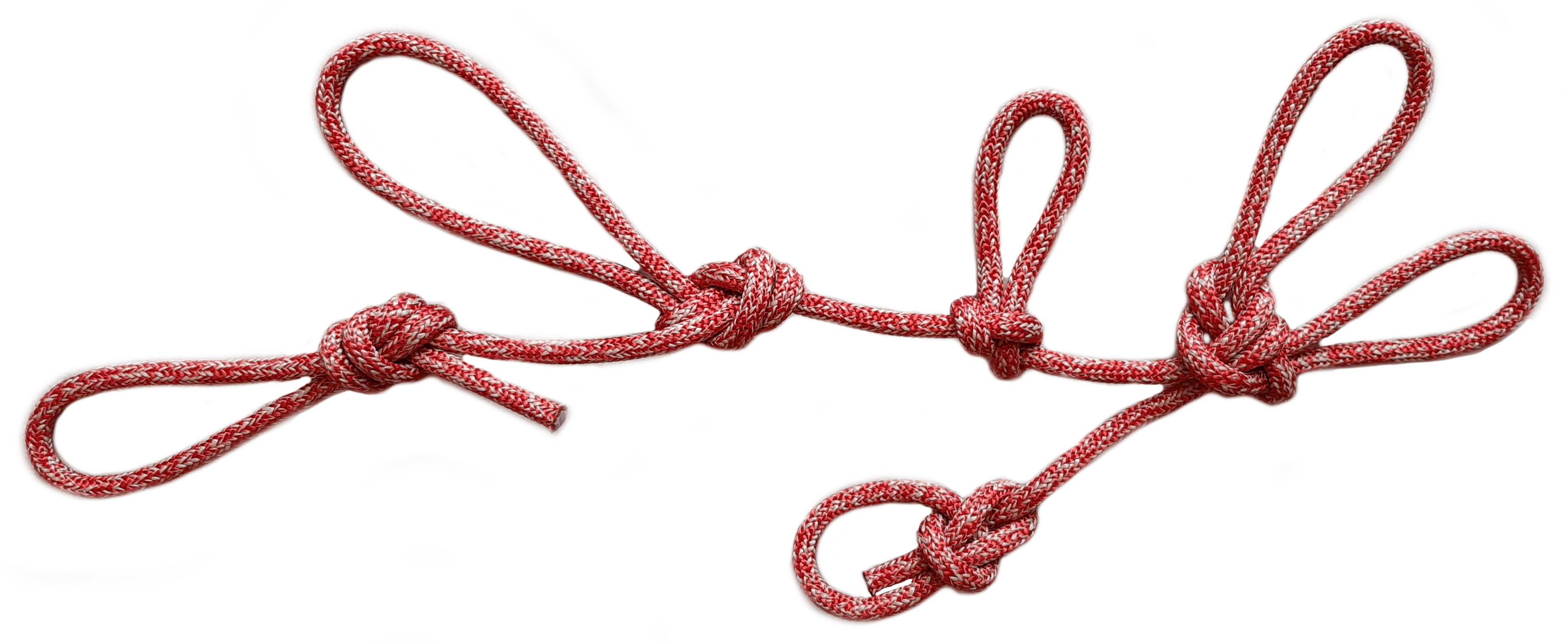 Rys. 42 Pętle wiązane na linie, od lewej: Kluczka, Ósemką na linie, Węzeł koński, Hiszpański ratowniczy, pętla bosmańska.
