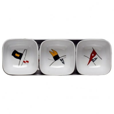 Zestaw zawiera 3 miseczki idealnie wpasowane w podłużną podstawkę. Podstawka osobno również może służyć jako naczynie do serwowania przekąsek.