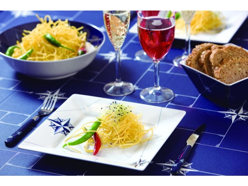 Naczynia żeglarskie opatrzone są w klasyczny wzór róży wiatrów w kolorze granatu i bieli.