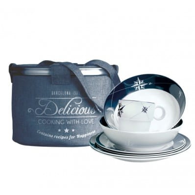 4 x talerz płaski Ø 25 cm kod: MB150014 x talerz deserowy Ø 20 cm kod: MB150034 x miska do zupy Ø 19 cm kod: MB150174 x kubek kod: MB150041 x składany kosz Zestaw zapakowany jest w praktyczny kosz Ø 30 cm; wys. 28 cm, który może posłużyć do przechowywania naczyń, lin, butów lub innych akcesoriów żeglarskich. Wszystkie naczynia wyprodukowane z wytrzymałej melaminy!Talerze, miski i kubki są opatrzone od spodu gumką antypoślizgową non-slip!