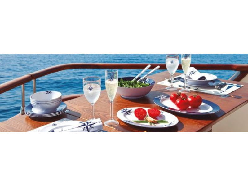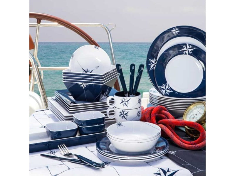 Naczynia żeglarskie opatrzone są w klasyczny wzór róży wiatrów w kolorze granatu i bieli.