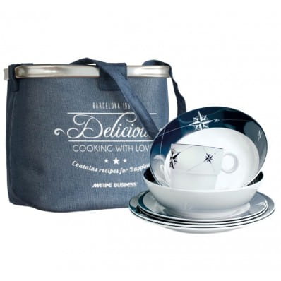 6 x talerz płaski Ø 25 cm kod: 150016 x miska do zupy Ø 19 cm kod: 150176 x talerz deserowy Ø 20 cm kod: 150036 x kubek kod: 150041 x praktyczny kosz Zestaw zapakowany jest w praktyczny kosz Ø 30 cm; wys. 28 cm, który może posłużyć do przechowywania naczyń, lin, butów lub innych akcesoriów żeglarskich. Wszystkie naczynia wyprodukowane z wytrzymałej melaminy!Talerze, miski i kubki są opatrzone od spodu gumką antypoślizgową non-slip!